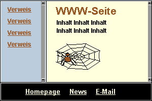 Mit Hilfe von Frames können Sie den Anzeigebereich des Browsers in verschiedene, frei definierbare Segmente aufteilen. Jedes Segment kann eigene Inhalte enthalten. Die einzelnen Anzeigesegmente (also die Frames) können wahlweise einen statischen Inhalt (= "non scrolling regions") oder einen wechselnden Inhalt haben. Verweise in einem Frame können Dateien aufrufen, die dann in einem anderen Frame angezeigt werden.